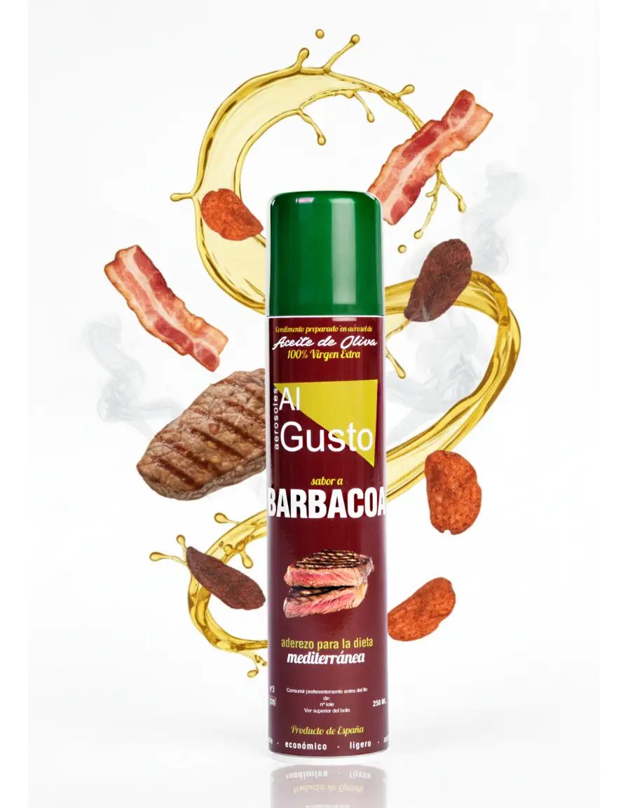 Aceite de oliva virgen extra sabor barbacoa en aerosol, ideal para aportar un